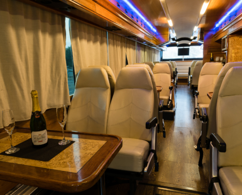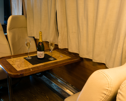 A welcome glass of champagne! The 36 seater VIP Lounger is an ulitame stunning alternative to limosine travel. We off services for Business, Corporate, Special events and intimate events, such as Weddings. With our comfy luxury leather recliners, corner seating and sleek cherry and rosewood interior, this classy form of transport is sure to impress.